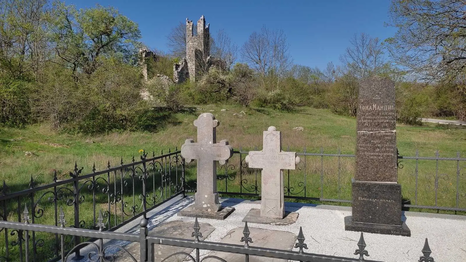 Одмах преко брзе воде, на другој обали Отуће, у нестварном миру, почивају три генерације Мандића. То су Николин, по мајци, прадјед Тома, дјед Никола и ујак Тома. По Теслином прадједу Томи сусједно насеље у коме су живјели Мандићи добило је име Томингај. Сва тројица богослужила су као свештеници у православном храму Пресвете Богородице, у чијем дворишту и почивају.